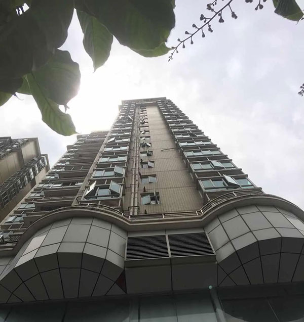 记者在现场了解到,该小区共有176户居民,每层5户,其中2、3、5、20层是一梯三户的复室,而事发的区域则疑似是临街的住户家洗手间的位置。物业表示该位置并没有安装监控。